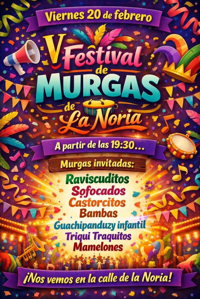 La fiesta del carnaval continúa y promete una noche cargada de música, color y alegría en el corazón del barrio. Este viernes 20 de febrero, a partir de las 19:30 horas, la Calle de La Noria será el escenario del V Festival de Murgas de La Noria, un encuentro ya tradicional que convoca a vecinos, familias y amantes del carnaval.