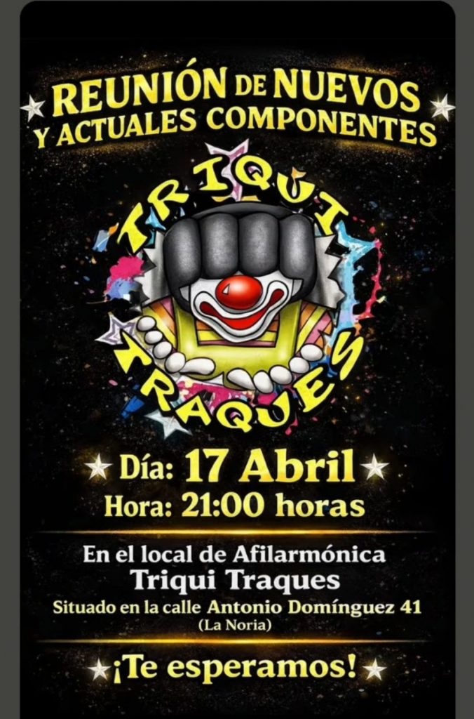 La agrupación festiva Triqui Traques ha anunciado la realización de una reunión dirigida tanto a sus miembros activos como a nuevos interesados en formar parte del colectivo. El encuentro se llevará a cabo el próximo 17 de abril a las 21:00 horas, en el local de la Afilarmónica Triqui Traques, ubicado en la calle Antonio Domínguez 41, en el sector de La Noria.