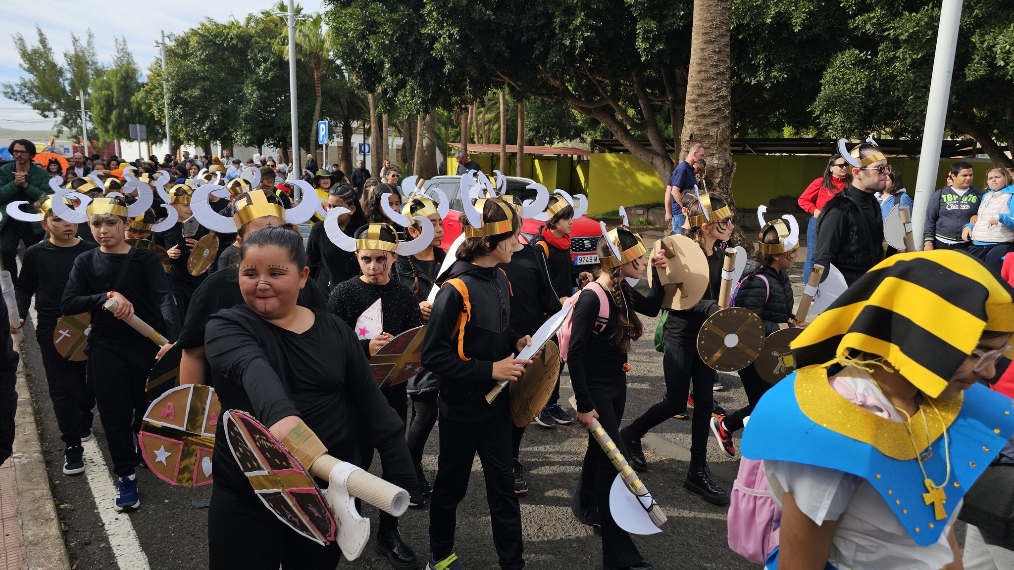 El recorrido estuvo acompañado por el ritmo contagioso de tambores y los aplausos de familiares, vecinos y docentes. La comitiva culminó en la gran carpa del Carnaval, donde fueron recibidos por el alcalde, Matías Peña, y el concejal de Festejos, Pedro M. Armas. Tras reponer energías con el avituallamiento ofrecido por el Ayuntamiento, los niños subieron al escenario en grupos para mostrar su talento artístico en una animada exhibición.