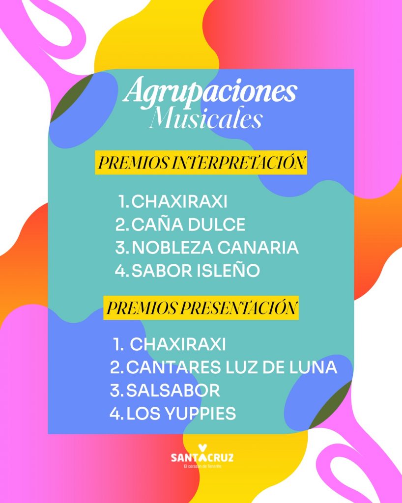 El concurso de Agrupaciones Musicales del Carnaval de Santa Cruz de Tenerife coronó a Chaxiraxi durante el certamen celebrado este domingo en el Recinto Ferial en el que ocho grupos tomaron parte en el siguiente orden: Los Yuppies, Salsabor, Teiderife, Cantares Luz de Luna, Nobleza Canaria, Chaxiraxi, Sabor Isleño y Caña Dulce.