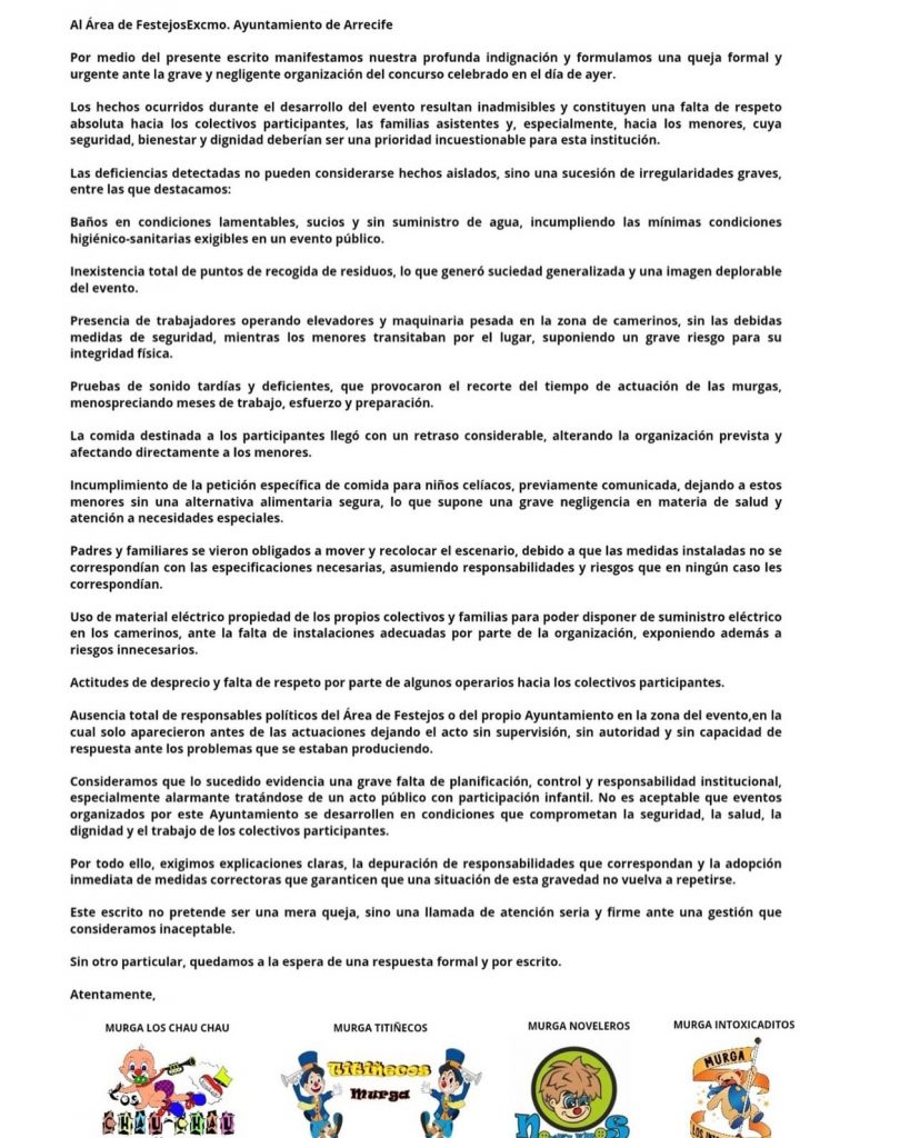 Varios colectivos participantes en un reciente concurso organizado por el Ayuntamiento de Arrecife han presentado una queja formal y urgente ante el Área de Festejos tras lo que califican como una grave y negligente organización del evento, celebrado el día anterior. Los denunciantes aseguran que durante el desarrollo del acto se produjeron numerosas irregularidades que comprometieron la seguridad, la salud y la dignidad de los participantes, con especial preocupación por la presencia de menores.