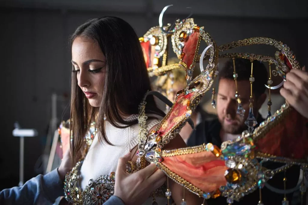 Cuando por fin las telas anaranjadas y los destellos cristalinos estuvieron ensamblados, la emoción se desbordó en el taller. “Alexis, ¿me lo puedo probar ya?”, bromeaban algunas estudiantes, ansiosas por sentir en su propia piel el fruto de tantas horas de esfuerzo. Pero el destino de la pieza era otro: volver a envolver a Carla Castro.