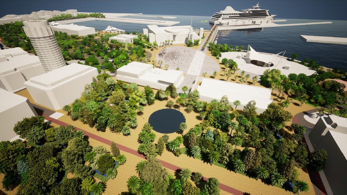 “El proyecto solucionaba varias necesidades en el Muelle de Sanapú: abría un espacio verde para los ciudadanos y dotaba de un lugar para eventos, ya fueran Carnaval, ferias o conciertos”, explica Haddad. La clave estaba en una idea sencilla sobre el papel: trasladar la rotonda del acceso sur del Puerto hasta la altura del Acuario. Ese movimiento liberaría una zona estratégica junto al Muelle de Santa Catalina.