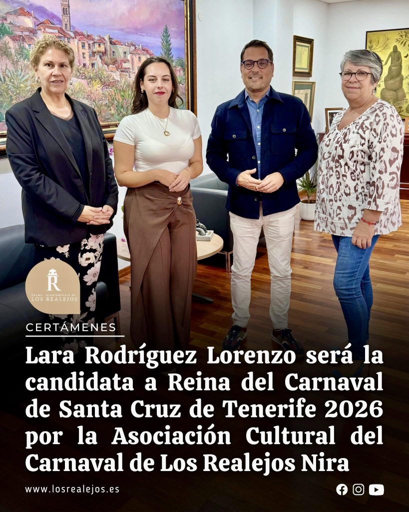 Lara Rodríguez Lorenzo será la candidata a Reina del Carnaval de Santa Cruz de Tenerife 2026 representando a la Asociación Cultural del Carnaval de Los Realejos Nira, que dirige la reconocida diseñadora Arganda Lorenzo. El anuncio oficial se realizó tras una reunión institucional en el Ayuntamiento de Los Realejos, donde ambas fueron recibidas por el alcalde, Adolfo González, y la concejala de Fiestas, Isabel Socorro.