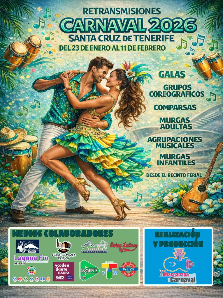 Santa Cruz de Tenerife volverá a latir al ritmo del Carnaval en 2026 y lo hará, además, con una amplia cobertura radiofónica que permitirá seguir los principales actos desde cualquier punto del Archipiélago y más allá. Bajo el título “Retransmisiones Carnaval 2026”, distintas emisoras unirán fuerzas para acercar al público la esencia de la fiesta más emblemática de la capital tinerfeña.