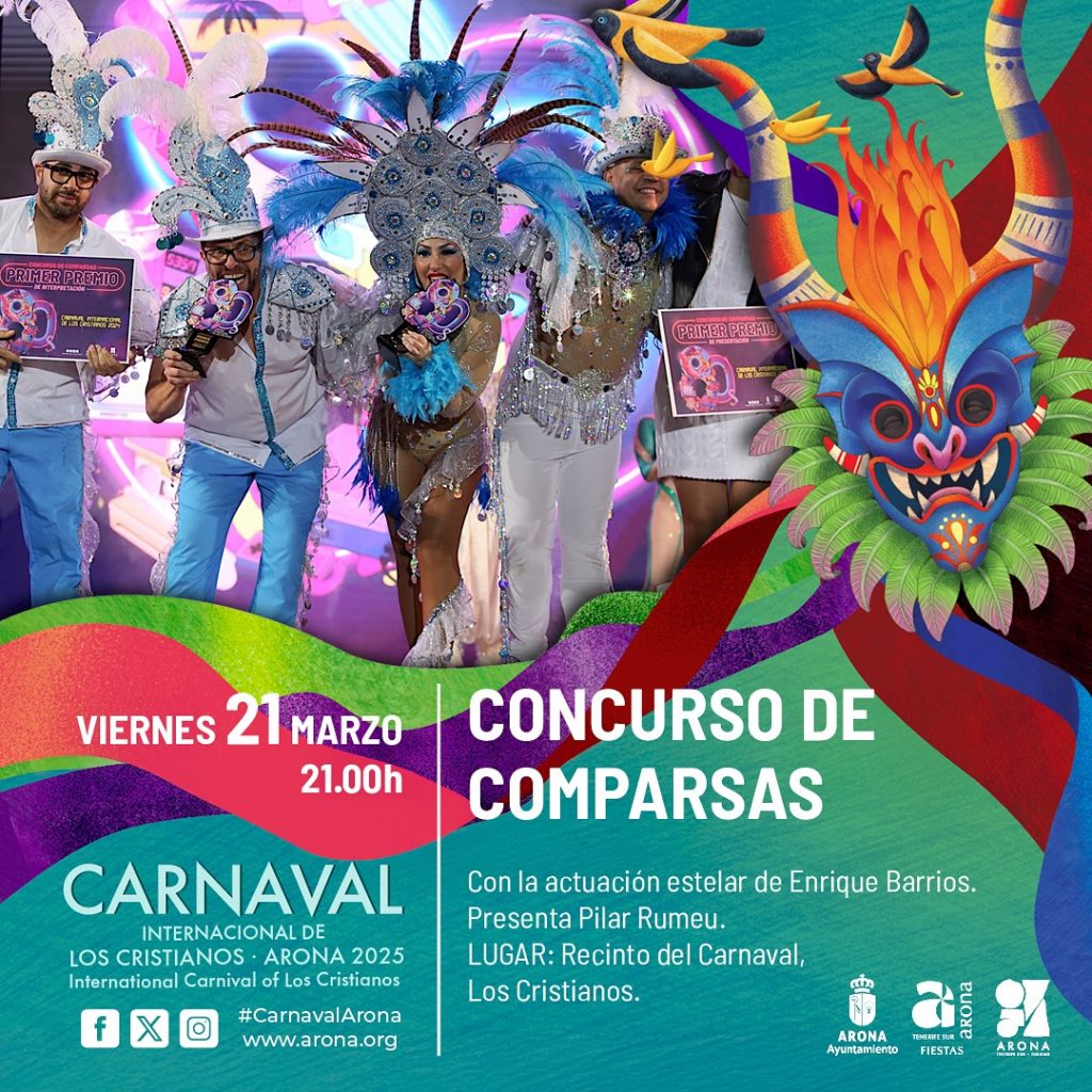 Este viernes, 21 de marzo, el carnaval internacional de Los Cristianos vivirá una de sus noches más esperadas: el concurso de comparsas. El evento tendrá lugar a partir de las 21:00 horas en el recinto del carnaval (Bulevar Chajofe), en Arona, y promete ser una velada llena de color, música y espectáculo.