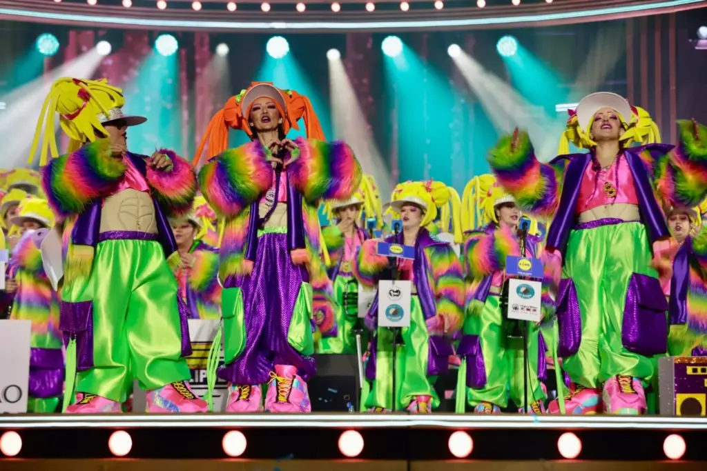 A continuación, Las Lady’s Chancletas tomaron el escenario con la fuerza de 57 murgueras dirigidas por Sarah Cervera Jiménez. Su propuesta, inspirada en una gran celebración carnavalera, transitó entre la sátira y la emoción con las canciones ‘El circo de la vida’ y ‘Ellas’.