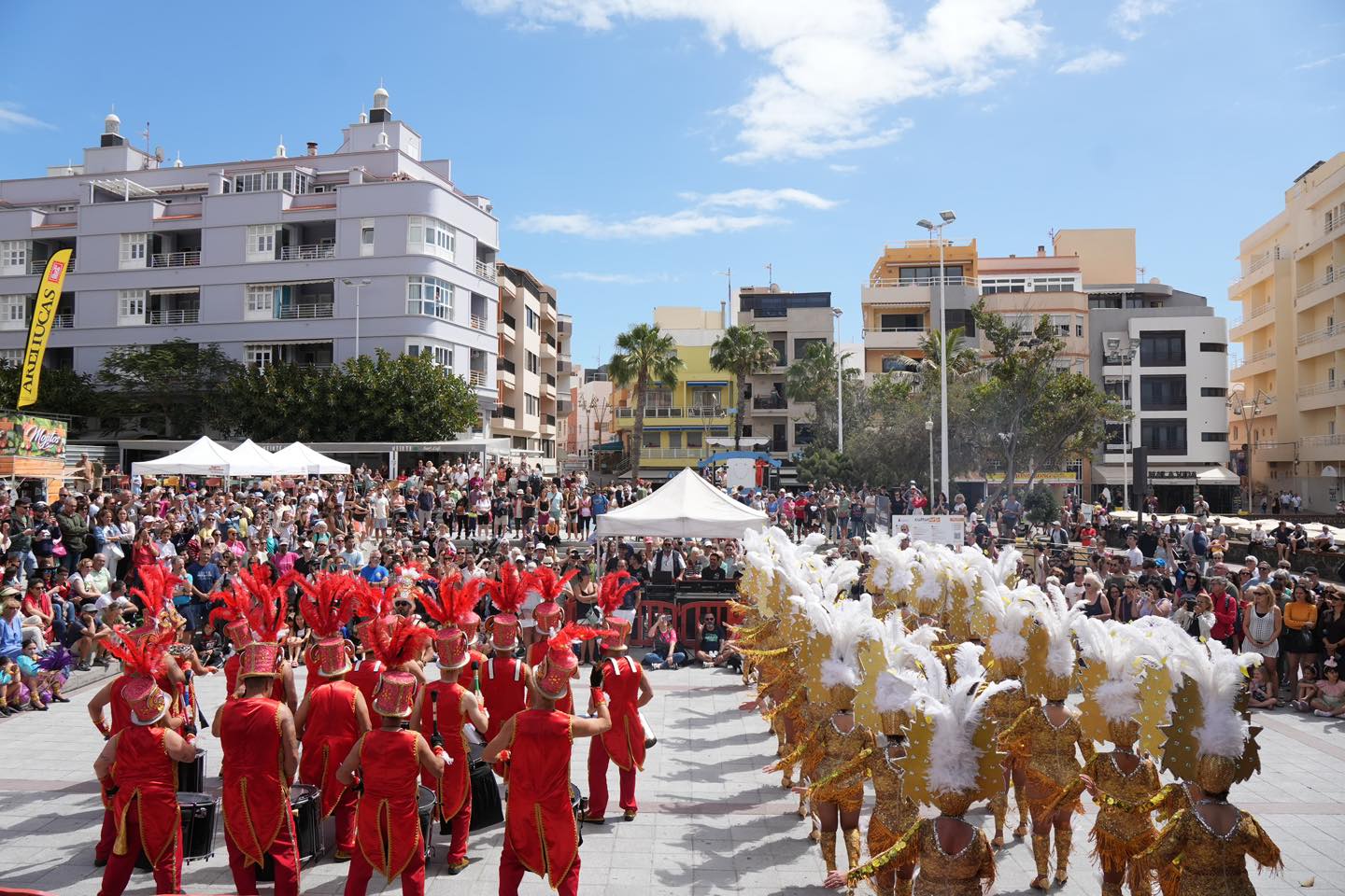 El evento, organizado por la concejalía de Cultura del Ayuntamiento, cuyo responsable es Francisco Socas Díaz, arrancó a las 11:00 de la mañana con un colorido pasacalle que partió desde Playa Chica hasta la plaza principal. Comparsas como Kuliquitacas del Sur, Guajeiros y su batucada, Aborasau y K’nadum, llenaron las calles de música y baile, contagiando a todos con su energía festiva.