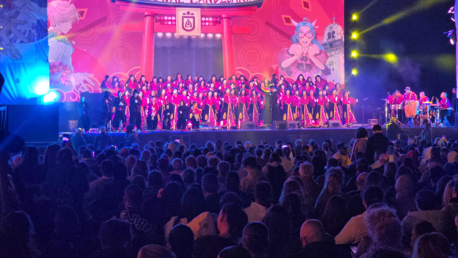 A las 21:30, cuando el viento aún movía los cables y hacía ondear la lona del backstage, la murga Chacho Tú saltó a las tablas y demostró que el carnaval no entiende de inclemencias. Los asistentes, arropados con varias capas de ropa y sujetando pelucas y sombreros para que no salieran volando, respondieron con palmas al ritmo de las letras.