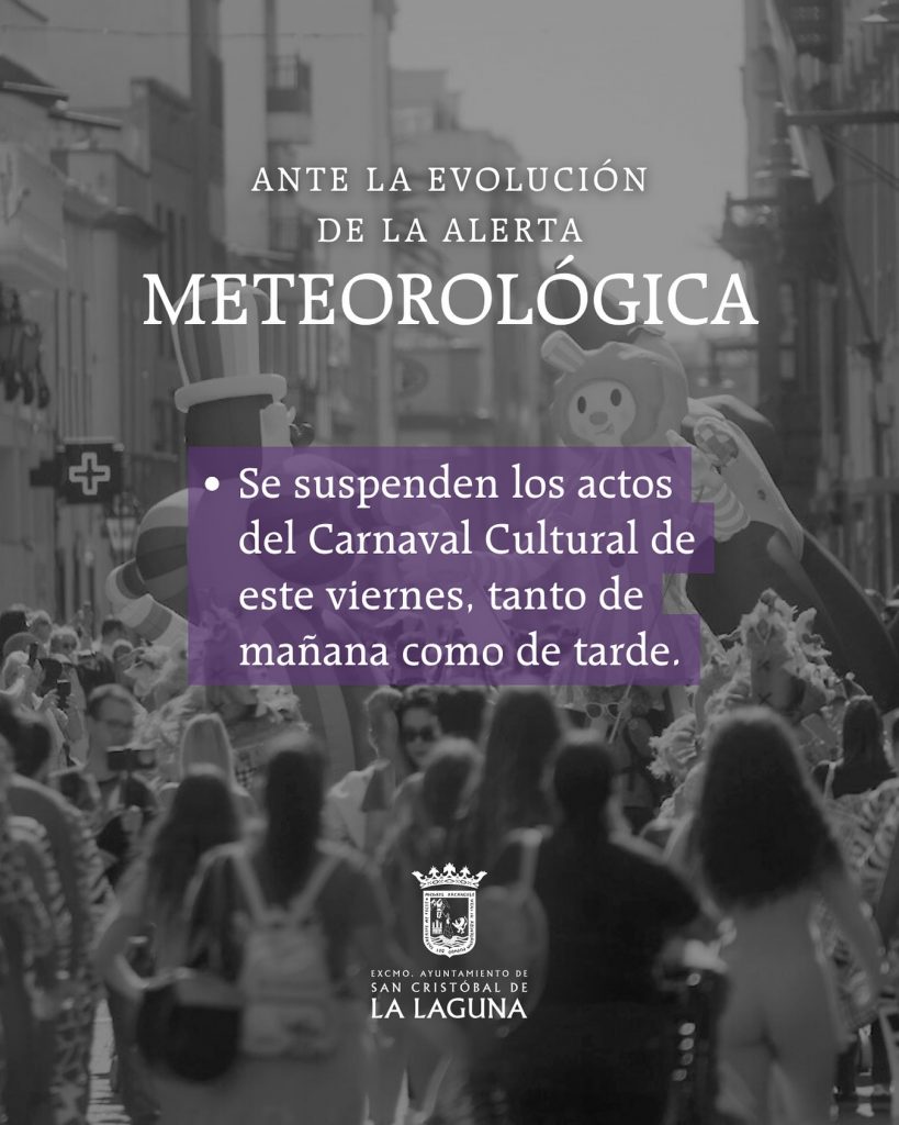 Las condiciones meteorológicas adversas han truncado la jornada festiva en La Laguna. El Ayuntamiento del municipio tinerfeño ha anunciado la suspensión de todos los actos del Carnaval Cultural previstos para este viernes, tanto en horario matutino como vespertino, debido a la previsión de lluvias y viento que afectan a la comarca.