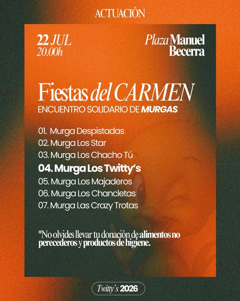 ¡Llegó el momento de celebrar con alegría y solidaridad! Las Fiestas del Carmen 2025 convocan a la comunidad a un emocionante Encuentro Solidario de Murgas, que se llevará a cabo el próximo martes 22 de julio a las 20:00 horas en la Plaza Manuel Becerra. Este evento, enmarcado en las festividades tradicionales, no solo promete una noche de música y diversión, sino también la oportunidad de apoyar a quienes más lo necesitan.