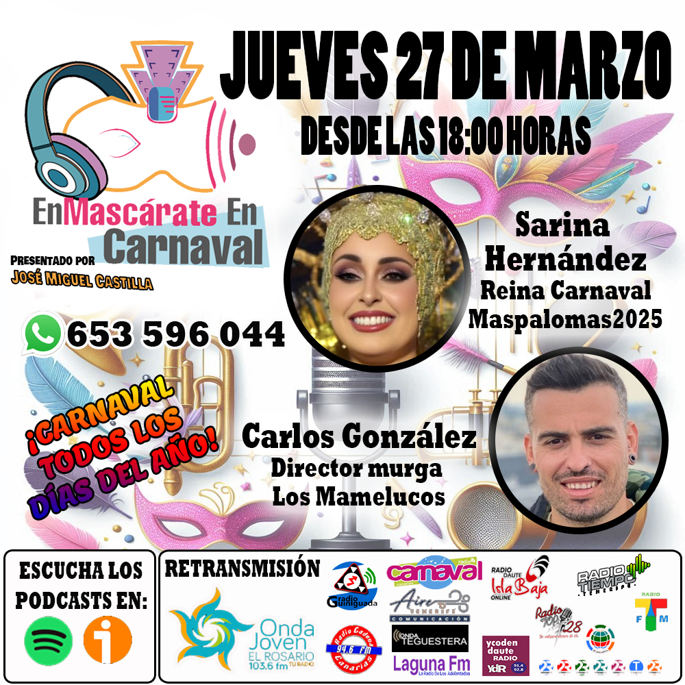 Cada semana, tu cita imperdible con el vibrante mundo del Carnaval llega de la mano de nuestro programa ‘EnMascárate En Carnaval’. Sumérgete en esta festividad que celebramos durante todo el año, todo en un emocionante formato de 90 minutos.