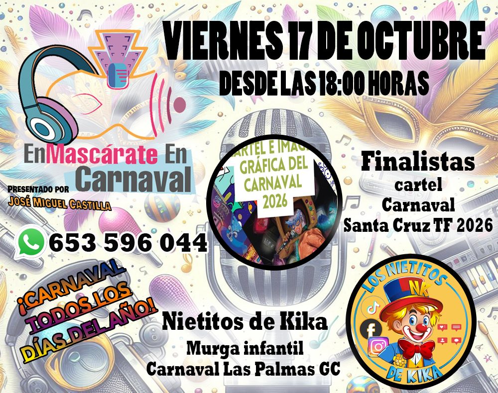 Tras una semana que termina, hoy tendremos el programa “EnMascárate En Carnaval” es tu cita semanal, consolidada como un referente del Carnaval canario durante todo el año, promete regresar con contenidos renovados, invitados destacados y un despliegue de ritmos y noticias para mantener viva la esencia de la fiesta más allá de febrero.