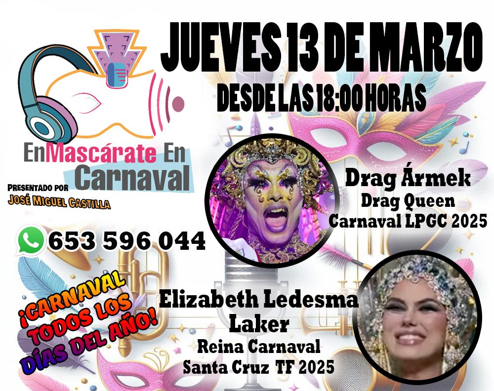 La energía del Carnaval se potencia con la participación del público. En ‘EnMascárate En Carnaval’ queremos escuchar tu voz. ¿Qué piensas sobre esta fiesta? ¿Tienes preguntas para nuestros invitados? Ahora es más sencillo que nunca, ya que hemos habilitado una línea de WhatsApp para que nos envíes tus mensajes y consultas al 653596044.