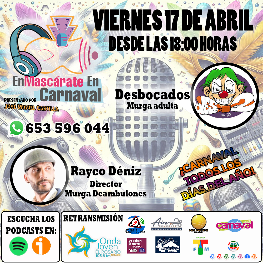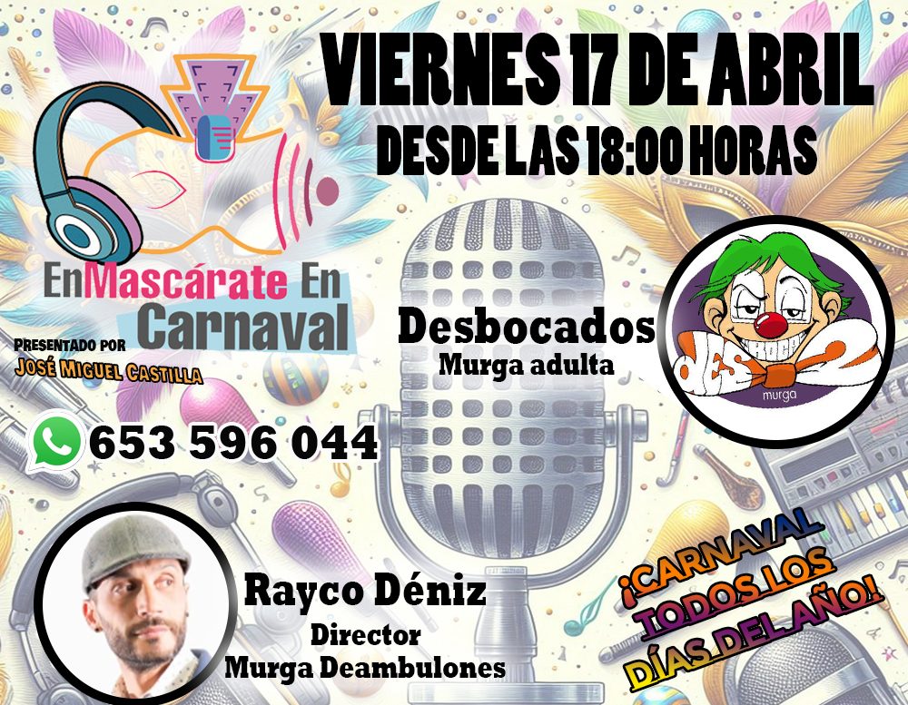 👉 Además, tendremos una entrevista muy especial con Juan Jesús Padilla, director de la murga Los Desbocados, que regresa a las tablas en 2027 tras su ausencia en el Carnaval 2026. Conoceremos de primera mano los motivos de aquel parón, cómo han vivido este año sin carnaval y con qué fuerzas y novedades vuelven para reencontrarse con su fiel afición.