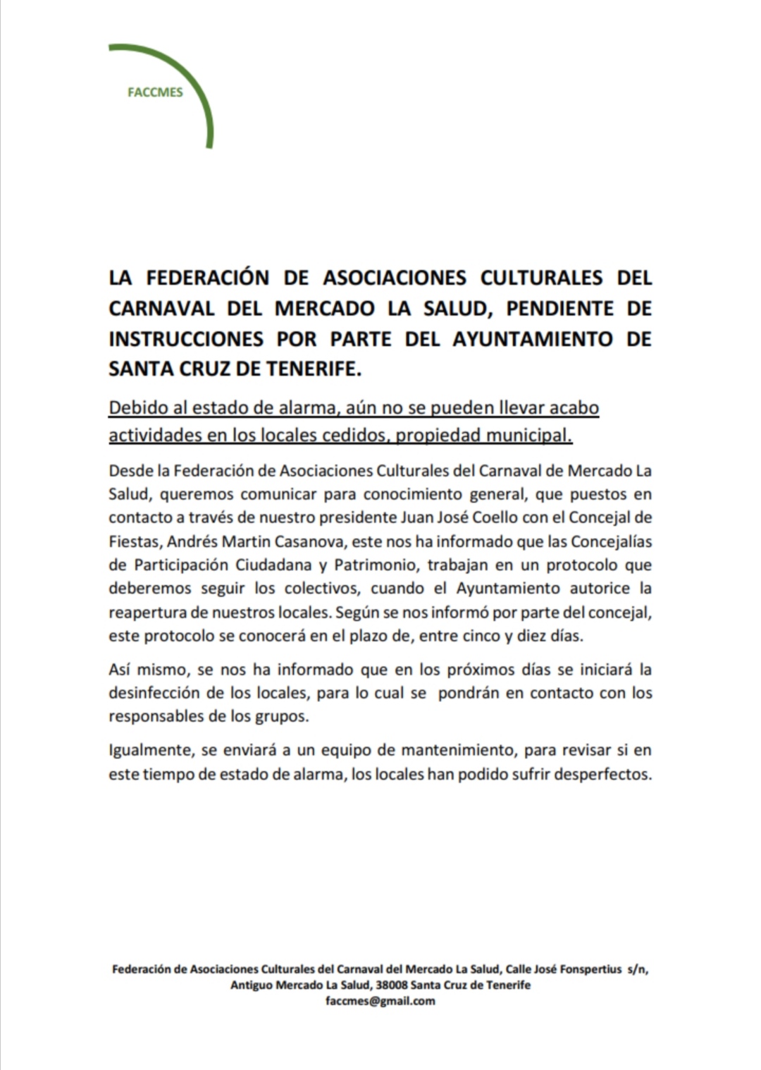 Desde la Federación de Asociaciones Culturales del Carnaval de Mercado La Salud, queremos comunicar para conocimiento general, que puestos en contacto a través de nuestro presidente Juan José Coello con el Concejal de Fiestas, Andrés Martin Casanova, este nos ha informado que las Concejalías de Participación Ciudadana y Patrimonio, trabajan en un protocolo que deberemos seguir los colectivos, cuando el Ayuntamiento autorice la reapertura de nuestros locales. Según se nos informo por parte del concejal, este protocolo se conocerá en el plazo de, entre cinco y diez días.