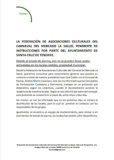 LA FEDERACIÓN DE ASOCIACIONES CULTURALES DEL CARNAVAL DEL MERCADO LA SALUD, ESTÁ PENDIENTE DE INSTRUCCIONES POR PARTE DEL AYUNTAMIENTO DE SANTA CRUZ DE TENERIFE.