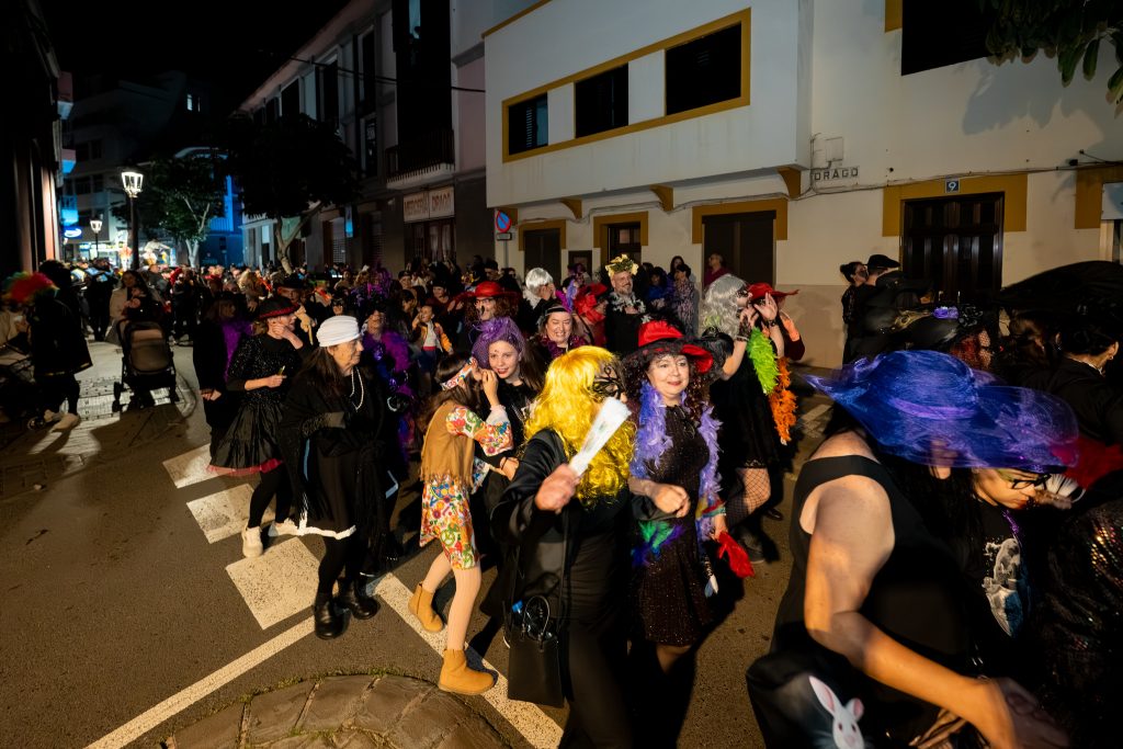 El séquito fúnebre partió desde el Polideportivo Municipal Juan Vega Mateos y avanzó entre suspiros y dramáticas escenificaciones de dolor hasta la Plaza de Santiago. Al frente, la Banda Guayedra, la Banda Archipiélago y el DJ Promaster marcaban el ritmo de una procesión atípica en la que el humor y la sátira se disfrazaron de luto riguroso.