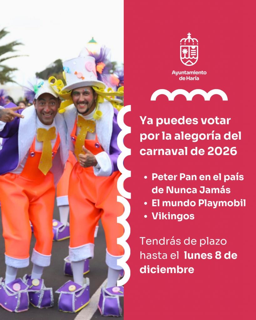 El Ayuntamiento de Haría ha puesto en marcha una consulta ciudadana para decidir la alegoría que protagonizará el Carnaval del próximo año 2026. Bajo el lema “¡Atención, tu voz nos importa!”, el Consistorio busca implicar a la población en una decisión que marcará el carácter de una de las fiestas más esperadas en el norte de Lanzarote.