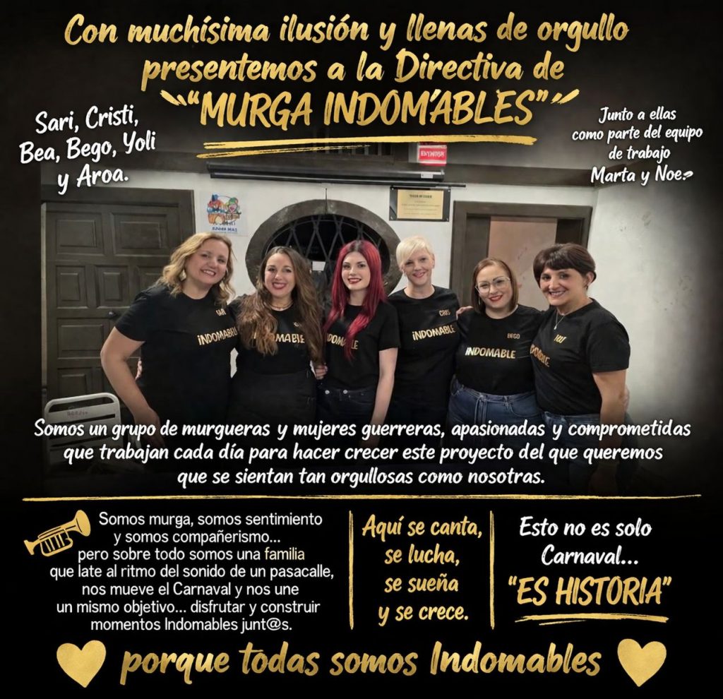 Con un mensaje cargado de emoción, compromiso y sentido de pertenencia, la Murga Indomables ha presentado oficialmente a su nueva directiva, integrada por Sari, Cristi, Bea, Bego, Yoli y Aroa, quienes asumen el liderazgo de este proyecto cultural profundamente arraigado en el espíritu del Carnaval.