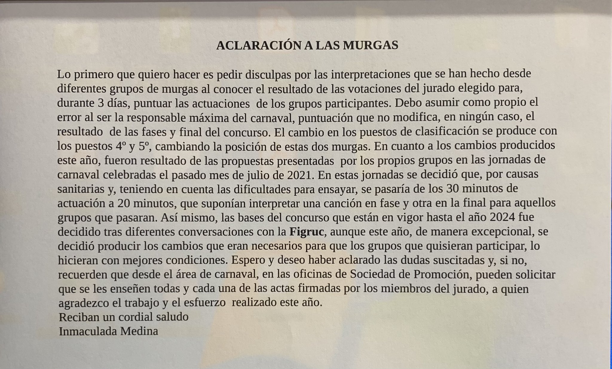 En el escrito divulgado por la responsable de la organización, lo primero que hace Inma Medina es “pedir disculpas por las interpretaciones que se han hecho desde diferentes grupos de murgas al conocer el resultado de las votaciones del jurado elegido para, durante tres días, puntuar las actuaciones de los grupos participantes”. Y precisa: “debo asumir como propio el error al ser la responsable máxima del Carnaval, puntuación que no modifica, en ningún caso, el resultado de las fases y final del concurso”.