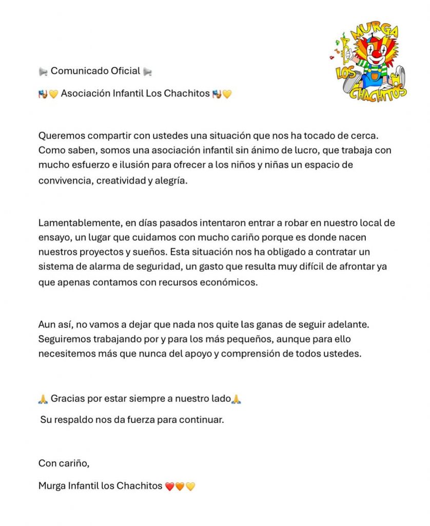 La Murga Infantil Los Chachitos, reconocida asociación sin ánimo de lucro dedicada a brindar espacios de convivencia, creatividad y alegría a los más pequeños, ha denunciado recientemente un intento de robo en su local de ensayo.