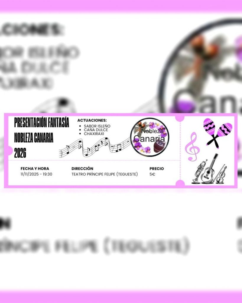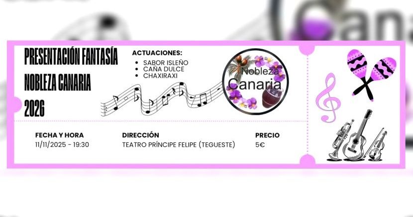 La Agrupación Musical Nobleza Canaria ha anunciado la presentación oficial de su fantasía para el Carnaval 2026, que tendrá lugar el próximo 11 de noviembre en el Teatro Príncipe Felipe de Tegueste. El evento, que comenzará a las 19:30 horas, contará con las actuaciones de las agrupaciones Sabor Isleño, Caña Dulce y Chaxiraxi, según ha informado la agrupación a través de sus redes sociales.