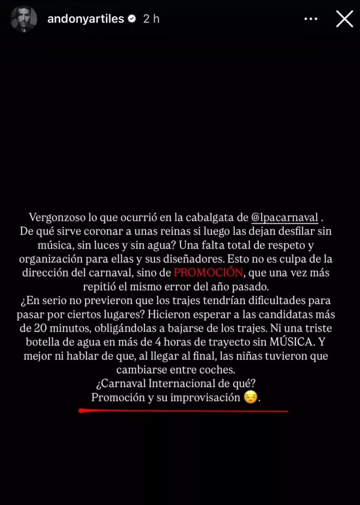El creador de contenido dirigió sus críticas directamente al área de Promoción del Carnaval, acusándola de repetir errores de ediciones anteriores y de actuar con “improvisación”. En su publicación, Artiles ironizó sobre el título de Carnaval Internacional, cuestionando la calidad de la organización y la falta de profesionalidad en la planificación del evento.