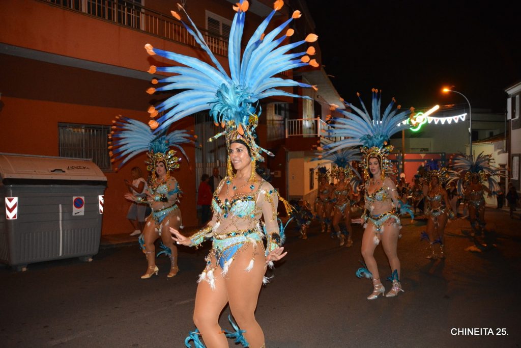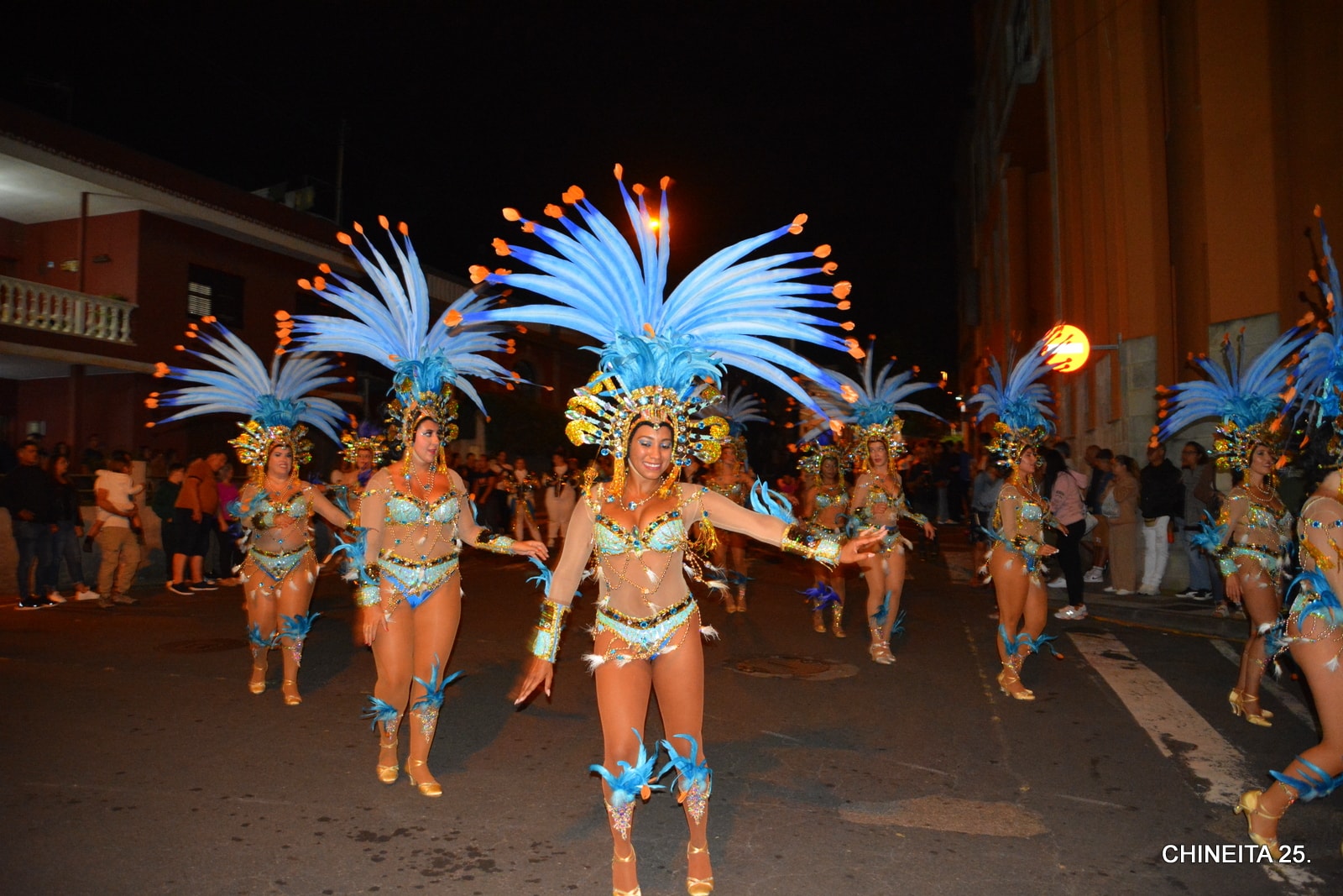 Las bailarinas desfilaron con deslumbrantes fantasías en tonos azules y plumas majestuosas, acompañadas por contagiosos ritmos que hicieron vibrar a vecinos y visitantes a lo largo del recorrido. El espectáculo transformó las calles de Tegueste en una auténtica fiesta, donde la música y la danza recordaron que el espíritu del carnaval está presente en cada celebración popular del municipio.
