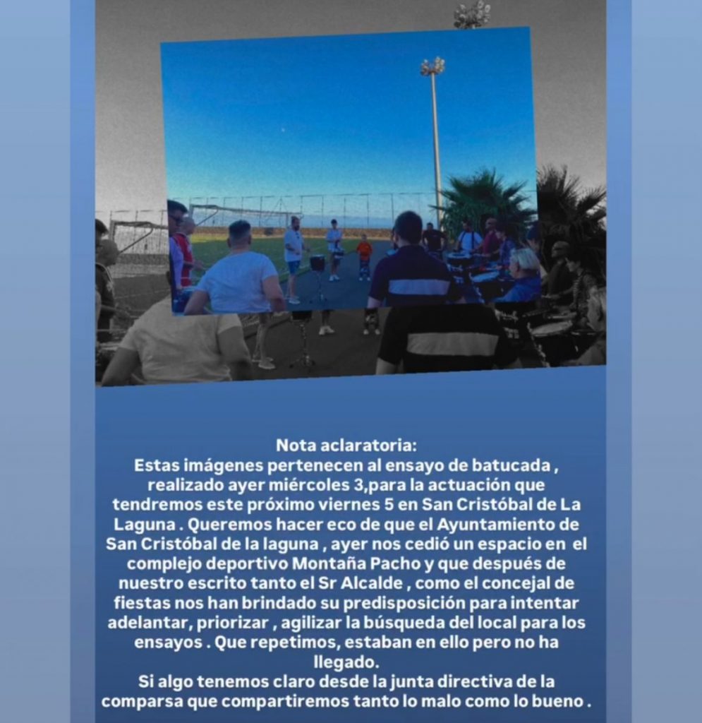 En un comunicado difundido en redes sociales, la agrupación quiso aclarar que, si bien agradecen la disposición del alcalde y del concejal de Fiestas por facilitar alternativas, aún no cuentan con un local fijo para sus ensayos. “Después de nuestro escrito, tanto el Sr. Alcalde como el concejal de fiestas nos han brindado su predisposición para intentar adelantar, priorizar y agilizar la búsqueda del local”, señalaron. Sin embargo, matizaron que esa solución definitiva “todavía no ha llegado”.