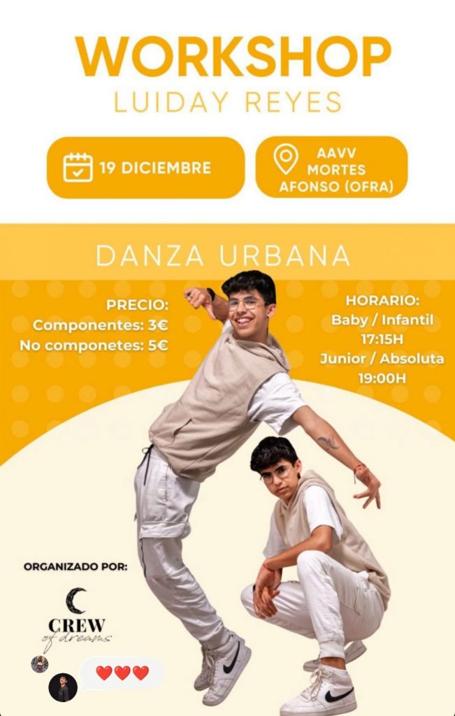 La danza urbana continúa consolidándose como una de las expresiones artísticas con mayor impacto entre niños, jóvenes y adultos. En ese contexto, el próximo 19 de diciembre se llevará a cabo un workshop de danza urbana impartido por el bailarín Luiday Reyes, en las instalaciones de la AAVV Mortes Afonso (Ofra).