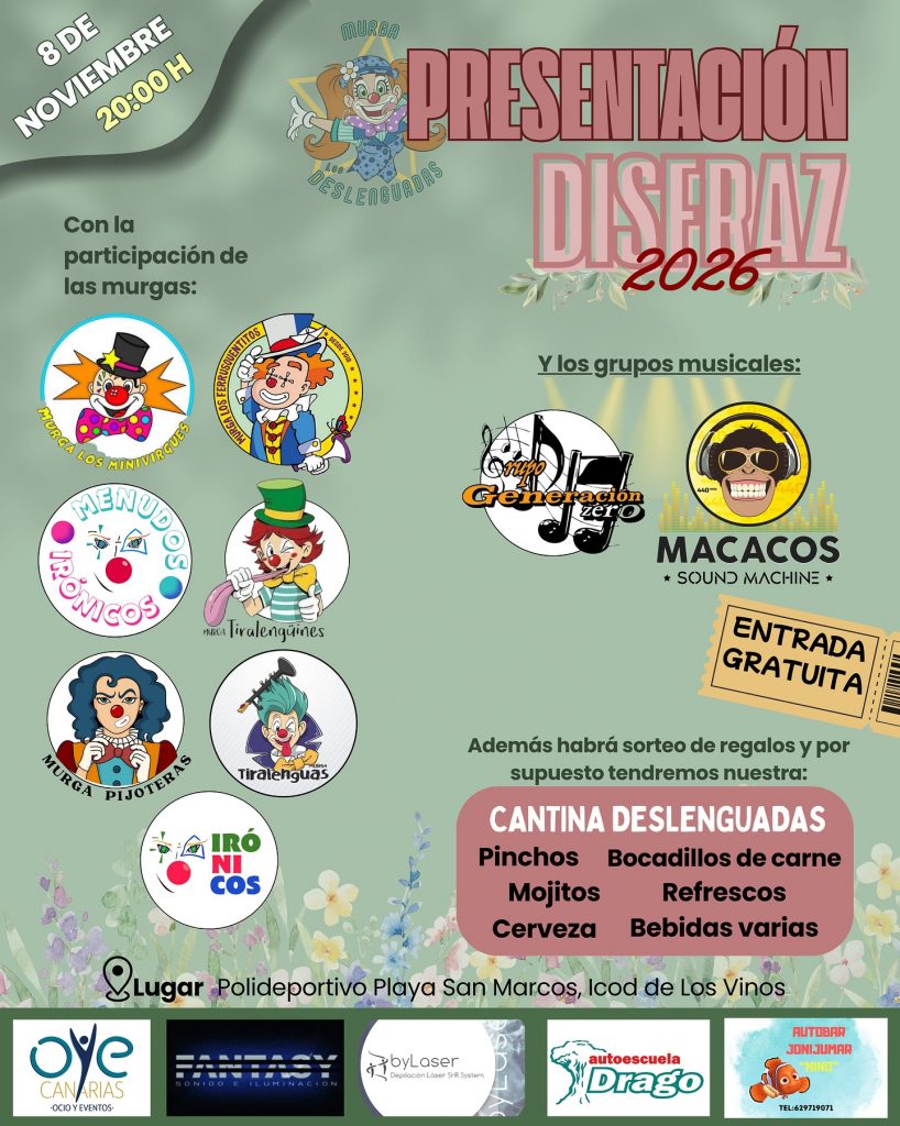 La murga Deslenguadas ha anunciado la presentación oficial de su fantasía para el Carnaval 2026, un evento que tendrá lugar el sábado 8 de noviembre a las 20:00 horas en el polideportivo de Playa San Marcos. La agrupación, que celebra su tercer año de trayectoria, convoca a seguidores y curiosos a descubrir el disfraz que lucirán en la próxima edición de los festejos.