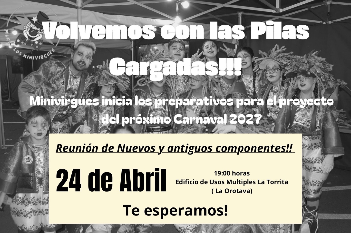 Bajo el lema «LLEGA MINIVIRGUES 2027», la agrupación invita a niñas y niños interesados en formar parte de este proyecto lleno de humor, música y disfraces a sumarse a la primera reunión informativa. La cita será el próximo 24 de abril a las 19:00 horas en el Edificio Múltiples de La Torrita, en La Orotava.
