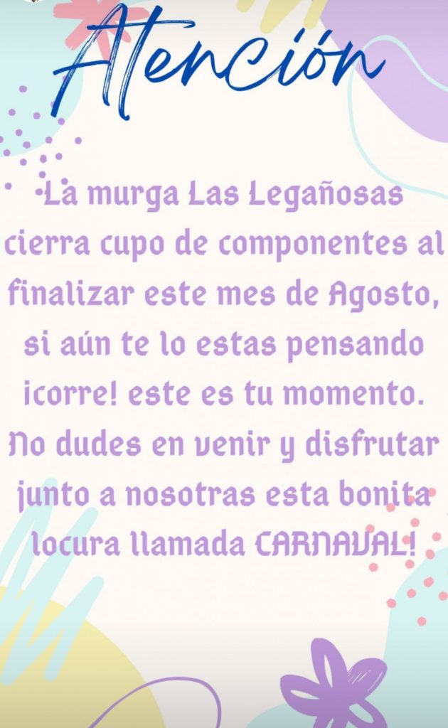 La murga Las Legañosas, uno de los grupos más representativos y con mayor proyección dentro del Carnaval, anunció a través de sus redes sociales que el plazo de inscripción para nuevos componentes cerrará al finalizar este mes de agosto.