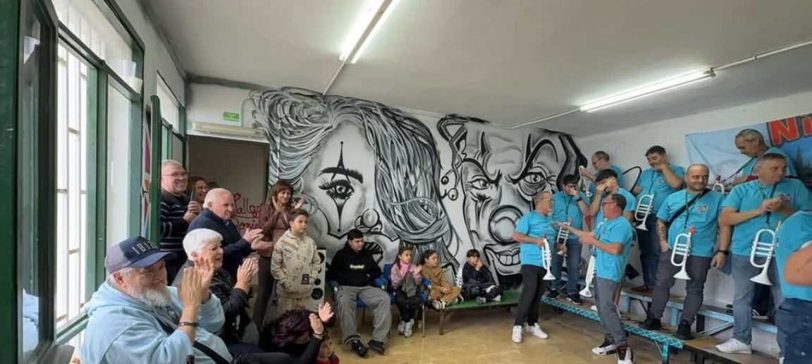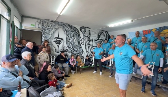 La imagen del encuentro refleja el carácter popular e intergeneracional de la murga: niños, adultos y personas mayores compartiendo el mismo espacio, mientras los músicos, vestidos con camisetas celestes y acompañados por instrumentos de viento, daban marco sonoro a la reunión. El mural que decora el local de ensayo aportó además un fuerte componente artístico a la escena.