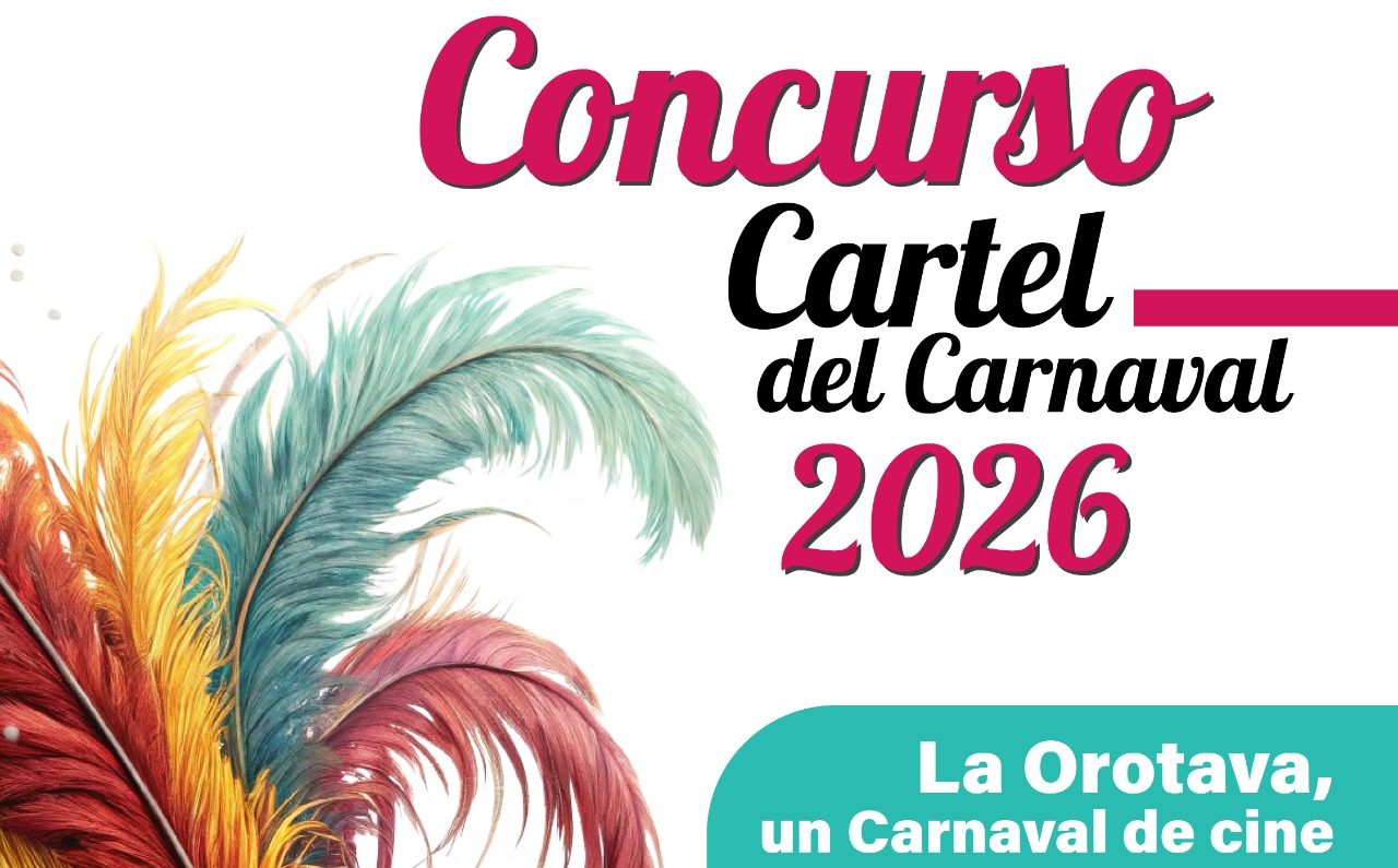 El ayuntamiento de La Orotava, a través de la concejalía de Fiestas que dirige Alexis Pacheco, abre el concurso del cartel del Carnaval 2026. El certamen, abierto a todas las personas residentes en Canarias, invita a participar de manera individual o colectiva. Los trabajos deberán estar basados en la temática oficial de los carnavales del próximo año: “La Orotava, un Carnaval de cine”, título elegido por la Comisión Mixta de las fiestas que está formada por representantes de todos los grupos participantes en estos festejos.
