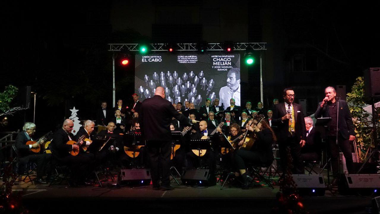 La plaza Duggi se vistió de gala y de espíritu navideño en la noche del jueves para acoger un emotivo concierto que reunió a numerosos vecinos de Santa Cruz. El encuentro musical, que se prolongó hasta tarde, estuvo protagonizado por la Unión Artística El Cabo y dos de las voces más reconocidas de Canarias: Chago Melián y José Manuel Ramos.