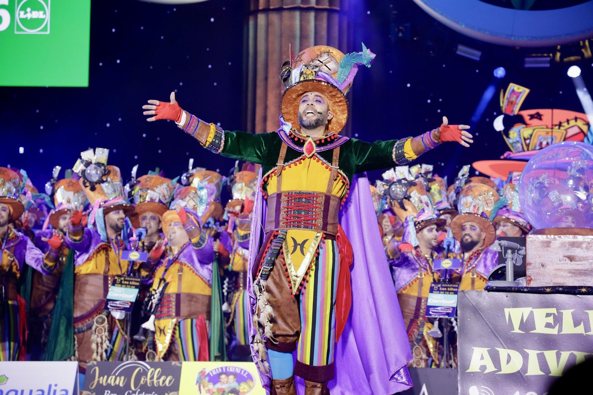 De Carrizal a Carrizal, Los Legañosos entraron con toda la fuerza que se esperaba de ellos. Al minuto ya tenían al público en sus manos, arriba como en pocos momentos a lo largo de la noche, con una fantasía llamativa con todo tipo de detalles: ‘¿Quieres saber tu destino? ¿Quién lo adivinará? El adivinador que lo adivine, buen adivinador será. El divino Tino el adivino que llegó al Carnaval’. El director, David Zurita, lo bordó con la bola mágica en una entrada que puso la nota alta a esta segunda fase.