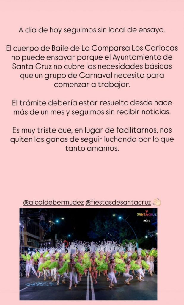 “El cuerpo de baile de la Comparsa Los Cariocas no puede ensayar porque el Ayuntamiento de Santa Cruz no cubre las necesidades básicas que un grupo de Carnaval necesita para comenzar a trabajar”, expresaron en su mensaje, en el que también aseguran que el trámite debería estar resuelto desde hace más de un mes.