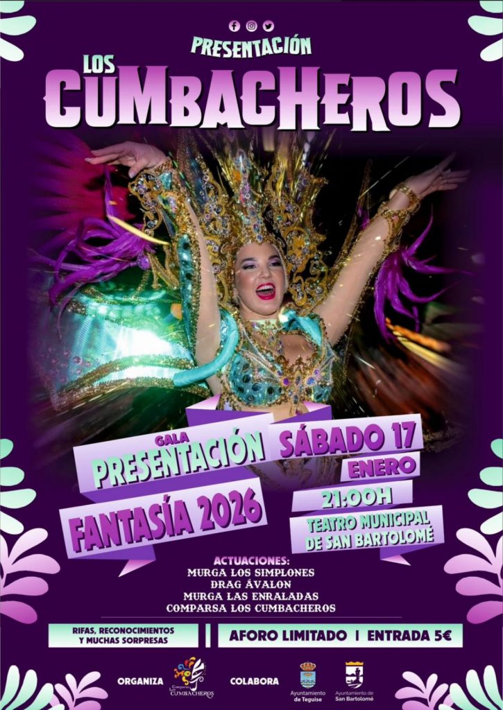La comparsa Los Cumbacheros da el pistoletazo de salida al carnaval con la esperada presentación de su Fantasía 2026, una gala que promete convertirse en una auténtica celebración del color, la música y la pasión carnavalera. El acto tendrá lugar hoy sábado 17 de enero, a las 21:00 horas, en el Teatro Municipal de San Bartolomé, con aforo limitado.