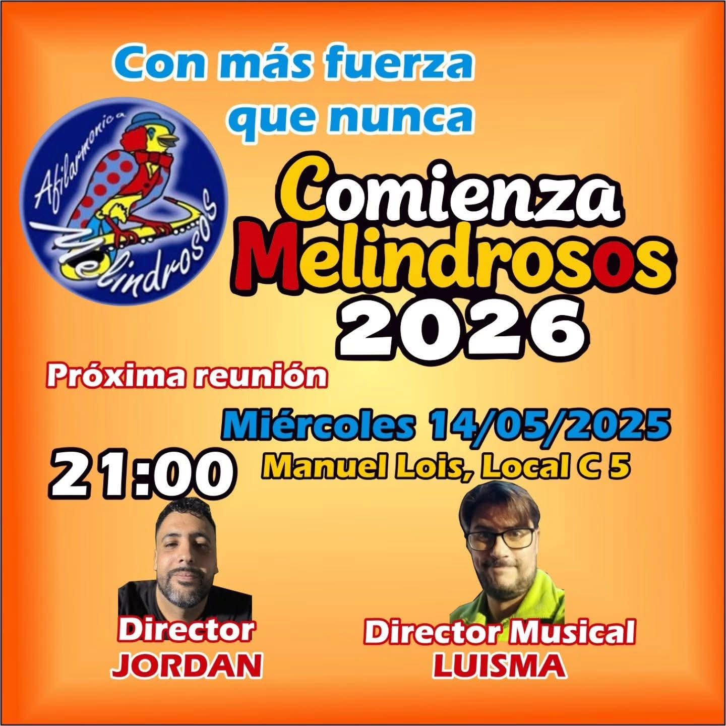 La murga Los Melindrosos ya calienta motores para la temporada 2026 con el lema “Con más fuerza que nunca”. La agrupación ha convocado su primera reunión informativa para el próximo miércoles 14 de mayo de 2025 a las 21:00 horas, en su sede habitual ubicada en Manuel Lois, Local C5.