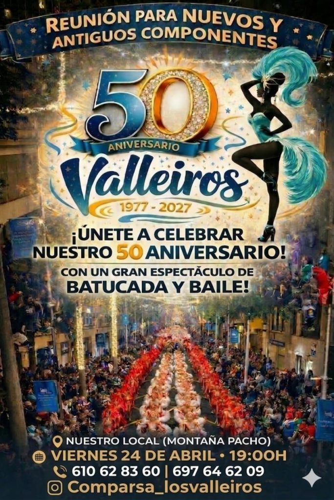 “No puedes perderte la oportunidad de vivir desde dentro el mejor carnaval del mundo”, señalan desde Los Valleiros en su convocatoria. Y añaden un aliciente extra: hacerlo acompañado de “nuestra gran familia”, justo en el año en que se cumplen cinco décadas de trayectoria.