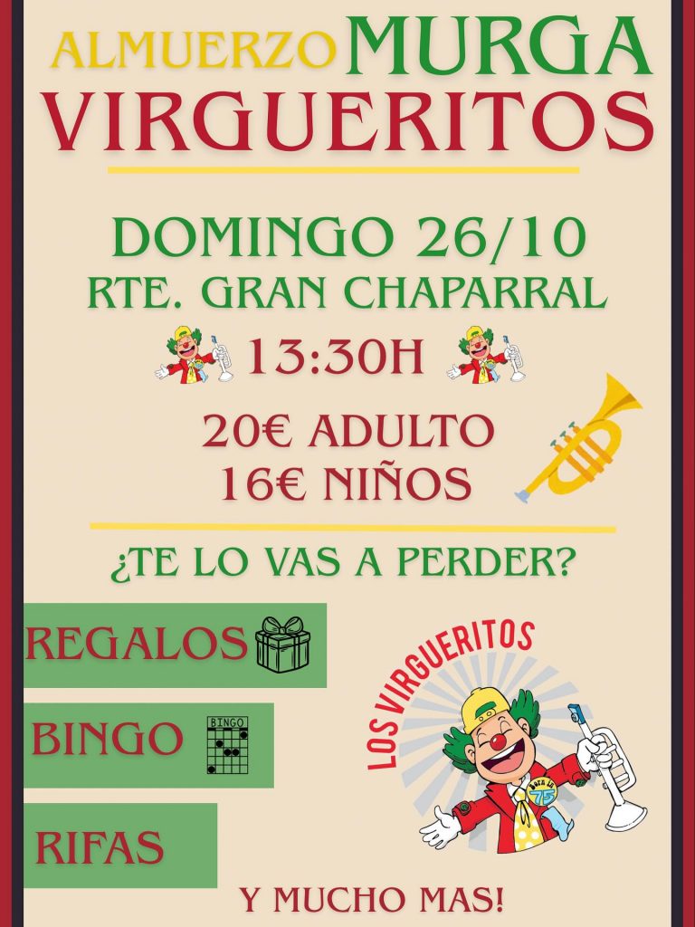 La murga Virgueritos ha anunciado ya la fecha de uno de sus eventos más emblemáticos y esperados: el almuerzo murguero que cada año marca el inicio de su temporada de actividades. La cita tendrá lugar el domingo 26 de octubre de 2025, a las 13:30 horas, en el Restaurante Gran Chaparral de La Perdoma, un encuentro que sirve como pistoletazo de salida oficial al “año virguerito”.