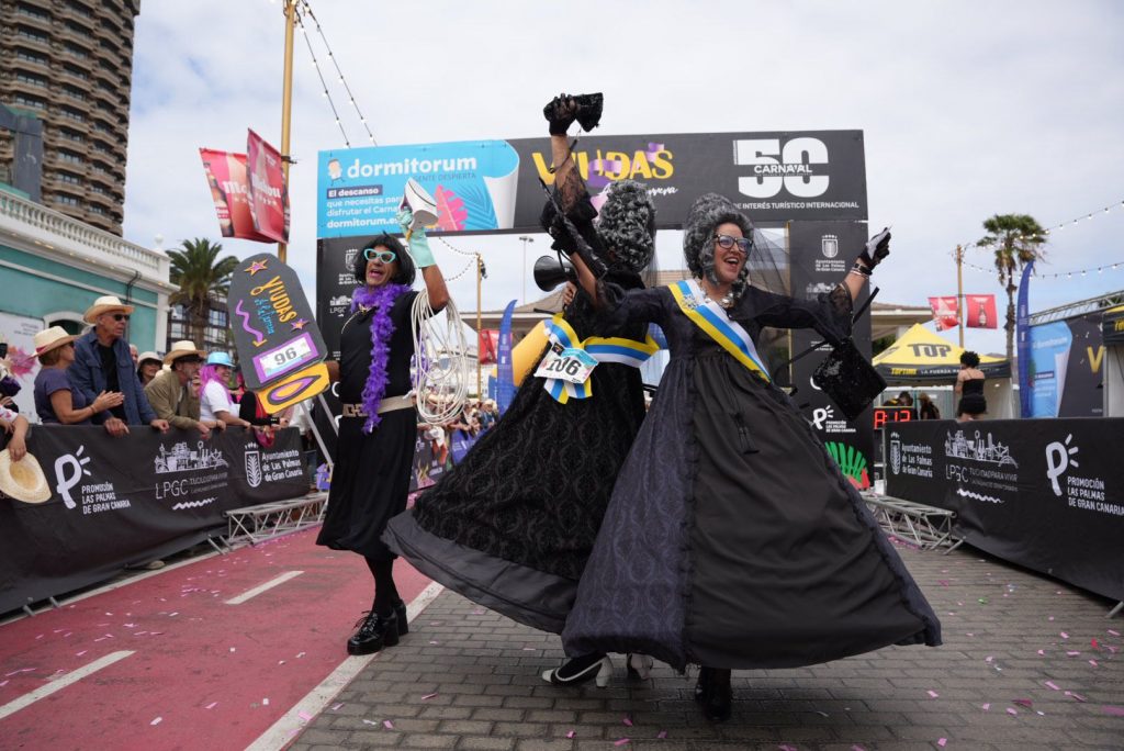 La jornada dominical arrancó con la segunda edición de «Viudas a la carrera». Sí, muchas viudas, pero también disfraces de todo tipo, ocuparon su lugar en el punto de salida: más de 250 personas inscritas esperaron la señal en la trasera del recinto para superar la distancia entre la plaza de Canarias y Manuel Becerra, rodear la plaza de La Isleta y regresar por el mismo camino.