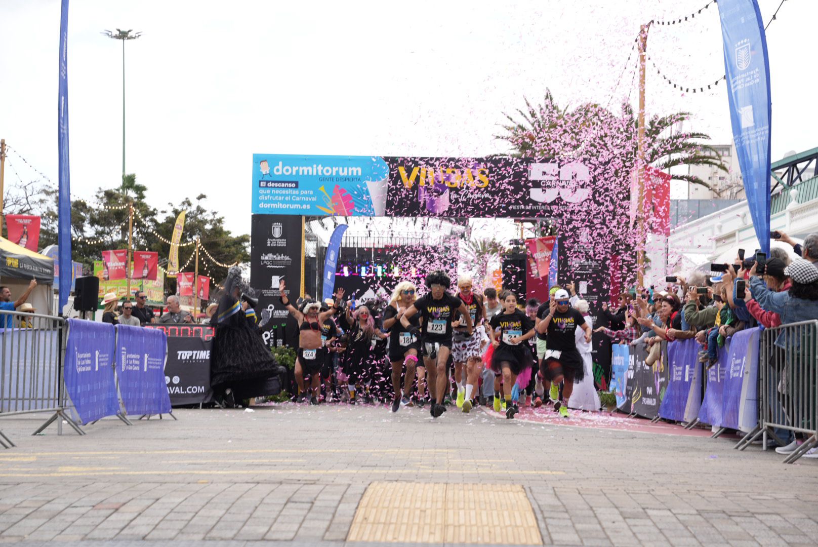 Todos y todas, minimascaritas y la veteranía en el disfraz dieron sus zancadas por Luis Morote, Eduardo Benot, Poeta Agustín Millares, Pérez Muñoz, Juan Rejón, Benartemi y Manuel Becerra en una y otra dirección. Ellas y ellos, protagonistas de la jornada, se reunieron en torno a este encuentro que pone en sintonía deporte y fiesta.