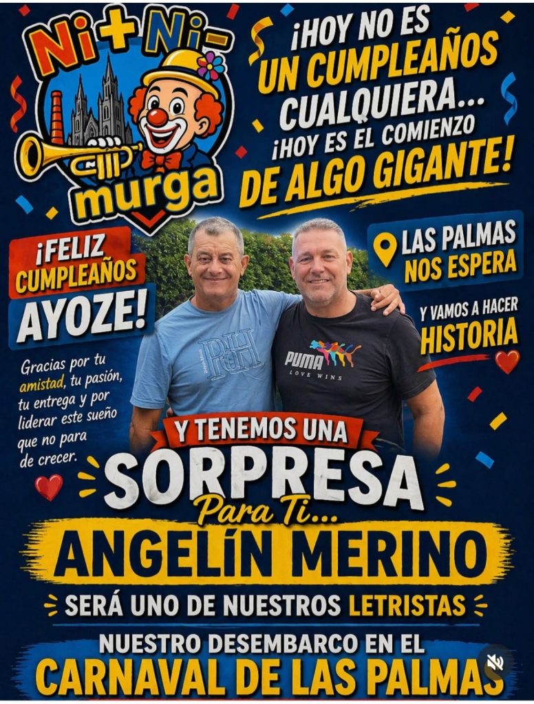 El anuncio fue realizado en el marco del cumpleaños de Ayoze, figura clave dentro del colectivo, a quien la murga dedicó un mensaje cargado de afecto y reconocimiento. “Gracias por tu amistad, tu pasión, tu entrega y por liderar este sueño que no para de crecer”, expresaron en la publicación, destacando su rol en el desarrollo del grupo.