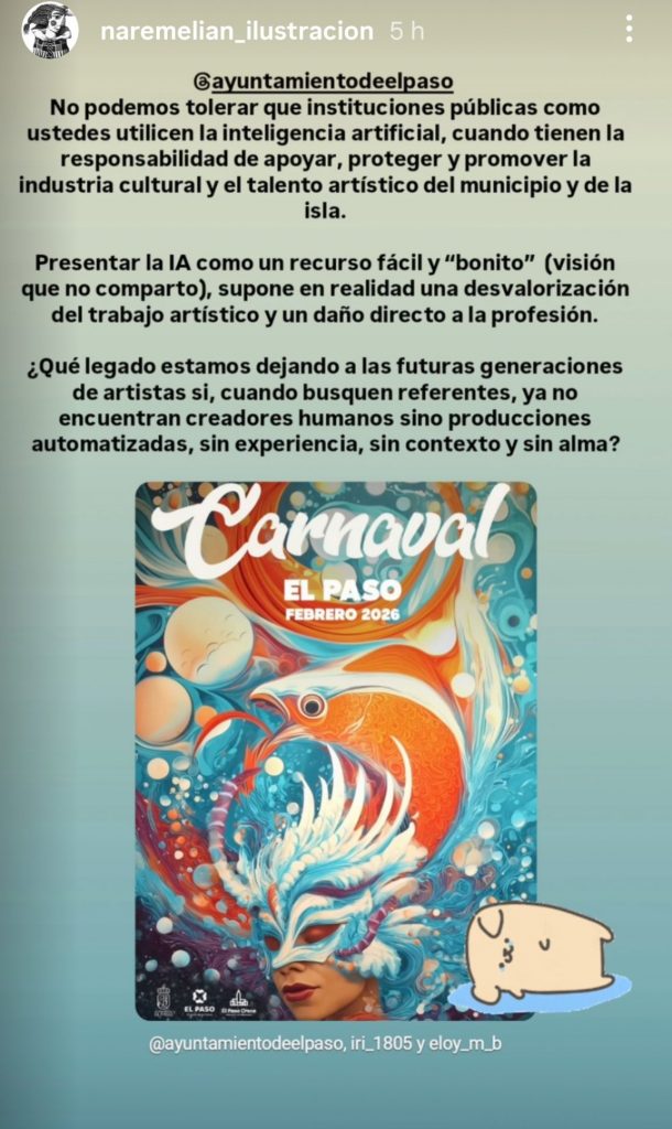 Una de las reacciones más destacadas ha sido la de la ilustradora Nareme Melián, quien a través de sus redes sociales cuestionó abiertamente la decisión del Ayuntamiento. En su mensaje, dirigido a la cuenta oficial municipal, denunció que las instituciones públicas “no pueden tolerar el uso de inteligencia artificial” cuando tienen la responsabilidad de “apoyar, proteger y promover la industria cultural y el talento artístico del municipio y de la isla”.