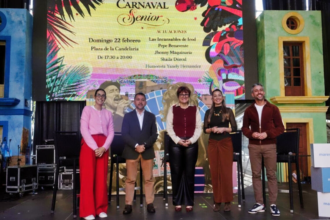 Santa Cruz de Tenerife acoge este domingo, 22 de febrero, la tercera edición del Carnaval Sénior de Canarias 2026, una iniciativa que organiza la consejería de Bienestar Social, Igualdad, Juventud, Infancia y Familias del Gobierno de Canarias. Los detalles de este festival fueron presentados por el alcalde de Santa Cruz, José Manuel Bermúdez; la consejera de Bienestar Social del Gobierno de Canarias, Candelaria Delgado; y la directora general de Mayores, Verónica Messeguer; quienes estuvieron acompañados por los concejales de Bienestar Social y Fiestas, Charín González y Javier Caraballero, respectivamente.