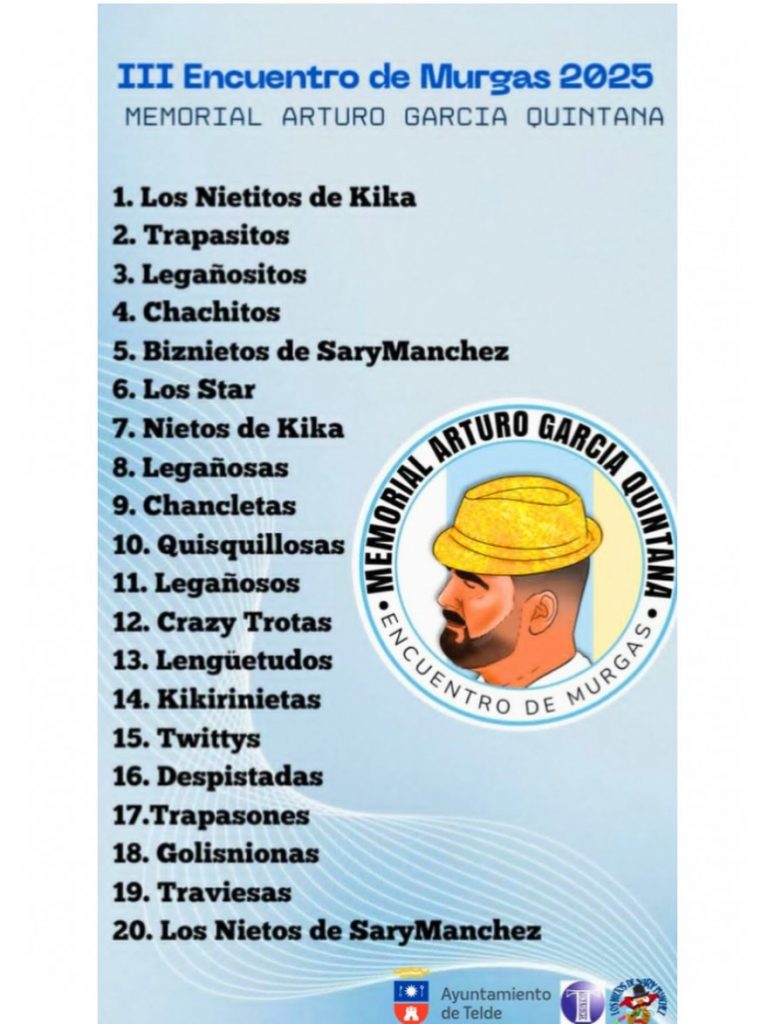 El encuentro, que rinde homenaje permanente a la figura de Arturo García Quintana, histórico impulsor de la fiesta en el municipio, contará con la participación de algunas de las murgas más queridas y reconocidas del panorama insular. Entre las confirmadas destacan Los Trapasitos, Los Legañositos, Los Biznietos de Kika, Los Chachitos, Los Star Murga, Trapasones, Los Twittys, Las Crazy Trotas, Afilarmónica Los Nietos de Kika y Despistadas, entre otras muchas.