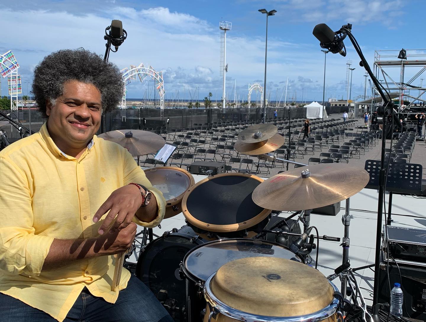 Conocido por un espectacular dominio de los elementos de percusión, Totó Noriega habla de ella como si fuera una religión. Hace más de diez años trabaja en un proyecto de festival de percusión que girará alrededor del tambor en Canarias que, gracias al ayuntamiento capitalino, verá la luz el año 2022. “He estudiado la percusión en las islas, que bebe de la tradición percutiva más antigua de África. El tambor, sobre todo el herreño, es uno de los más impresionantes del mundo. Con Pancho Amat quedé impresionado y enamorado de la fuerza rítmica del tajaraste herreño durante la Bajada de la Virgen. Los golpes del tambor acompañados de las castañuelas y las chácaras me marcaron mucho”, dice. “A partir de entonces no he dejado de estudiar las distintas formas de uso que poseen los instrumentos de percusión en la música popular de las islas. De esas formas he podido extraer recursos concretos que luego he aplicado en mi manera de desarrollarme como percusionista en proyectos vinculados a las estéticas populares producidos por el timplista Germán López, el grupo Olga Cerpa y Mestisay, el desaparecido José Antonio Ramos…”.